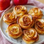 Store leftover apple roses in an airtight container at room temperature for up to 2 days. For longer storage, refrigerate for up to 4 days. To reheat, warm gently in a low oven (about 300˚F) for 5-7 minutes to maintain crispness. Avoid microwaving to keep the pastry flaky.