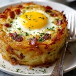 A round, thick hash brown cake sits on a white plate with a golden-brown crispy edge. The cake has visible shredded potatoes mixed with small pieces of browned bacon throughout its layers. On top, a sunny-side-up egg with a bright yellow yolk and glossy white is garnished with scattered green herbs, adding a fresh color contrast. The plate is on a white marbled surface, with a silver fork resting near the edge. Photo taken with an iphone --ar 4:5 --v 7
