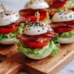 BLT Egg Sliders are a fun and flavorful twist on the classic BLT sandwich, featuring hard-boiled eggs as the “bread.” These bite-sized treats combine crispy bacon, fresh lettuce, and juicy tomato with a tangy mustard spread, perfect for appetizers or a light snack.