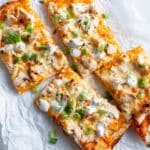 - Garnish and Serve: Remove the flatbreads from the oven and sprinkle with sliced green onions. Add additional buffalo sauce and blue cheese dressing as desired. Slice and serve immediately while hot.