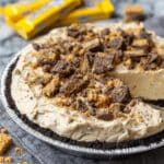 A deliciously creamy and crunchy Butterfinger Pie made with a peanut butter and cream cheese filling mixed with crushed Butterfinger bars, all set in a chocolate graham cracker or Oreo crust. This no-bake dessert is perfect for peanut butter and candy lovers looking for an easy, crowd-pleasing treat.