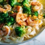A flavorful Cajun Shrimp Pasta featuring tender shrimp, vibrant broccoli, sweet corn, and creamy lemon-infused sauce, perfectly seasoned with Cajun spices and topped with parmesan cheese and fresh parsley. This quick and easy skillet dish blends spicy, tangy, and savory flavors for a satisfying weeknight meal.