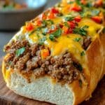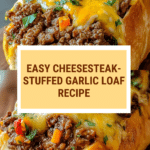 A savory and indulgent cheesesteak-stuffed garlic loaf featuring tender flank steak, sautéed bell peppers and onions, melted provolone cheese, and fresh garlic, all baked inside a crusty French bread loaf for a delicious and hearty meal.
