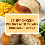 Store leftover chicken pillows in an airtight container in the refrigerator for up to 3 days. Reheat in the oven at 350 degrees F for 10–15 minutes to restore crispiness. The gravy can be refrigerated separately and reheated on the stove or microwave.