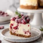 This cranberry cheesecake combines creamy, smooth cheesecake with a tangy cranberry swirl and a crunchy graham cracker crust. Topped with a luscious white chocolate mousse and festive sugared cranberries and rosemary, it’s perfect for holiday gatherings or any special occasion.