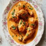 A white oval plate with a vintage floral pattern around the edges holds seven pieces of chicken, covered in a rich, creamy orange sauce. Each piece of chicken is coated in the thick sauce, which pools around the bottom of the plate, giving a smooth texture. The chicken pieces include a mix of drumsticks and thighs, each with a slight sheen from the sauce. Small green parsley leaves are placed on top of several chicken pieces for a fresh contrast. The plate is set on a white marbled surface, with a bit of rustic charm. photo taken with an iphone --ar 4:5 --v 7
