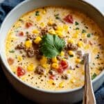 Creamy Cowboy Soup is a hearty, comforting dish packed with ground beef, beans, corn, potatoes, and a blend of smoky spices, finished with creamy cheese and heavy cream for richness. Perfect for a cozy meal on a chilly day, this one-pot soup offers a delightful mix of textures and southwestern flavors with easy preparation in a Dutch oven.