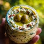 A glass jar filled with a creamy mix with visible small pieces of green herbs, red bits, and white chunks throughout, topped with a pool of golden olive oil in the center, and two shiny green olives resting on top. The jar is held by a woman's hand, with a blurred green natural background. The texture of the mixture looks smooth yet chunky with mixed colors inside. photo taken with an iphone --ar 4:5 --v 7
