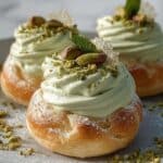 Store the pistachio cream covered in an airtight container in the refrigerator. It will keep well for up to 3 days. Before serving, gently stir and, if needed, re-whip briefly to restore its fluffy texture. Avoid freezing, as it may change the cream’s consistency.