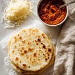 The image shows a stack of three round flatbreads with a golden-brown spotted texture, placed on white parchment paper at the bottom left. Above the flatbreads is a small pile of shredded pale yellow cheese with a soft, stringy texture. To the right of the cheese is a white bowl filled with chunky, deep red-orange sauce with visible texture, and a spoon resting inside. A light beige cloth with a rough texture is draped loosely along the right edge of the frame, all set against a white marbled surface. Photo taken with an iphone --ar 4:5 --v 7
