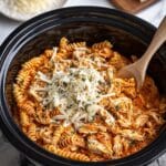 - Shred and Add Cream: Remove the chicken and shred it with two forks. Return the shredded chicken to the crockpot, then stir in the freshly shaved parmesan cheese, heavy whipping cream, and uncooked rotini pasta. Cover again and cook on low for 30 minutes or high for 15 minutes until the pasta is tender.