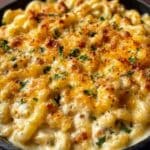 The image shows a close-up of a black skillet filled with creamy macaroni and cheese. The top layer of the dish is golden brown and slightly crispy with melted cheese that has a light yellow and orange tint. Small bits of browned cheese and herbs are scattered evenly across the surface. The macaroni noodles underneath appear soft and covered in a smooth, thick cheese sauce that is pale yellow. Photo taken with an iphone --ar 4:5 --v 7