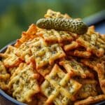 Keywords: Dill pickle Chex mix, savory snack, party snack, baked snack mix, dill pickle recipe, ranch seasoning snack, crunchy snack mix, homemade Chex mix