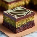 - Assemble the Brownies: Spread the chocolate ganache over the pistachio filling layer evenly. Warm 2 tablespoons of pistachio cream slightly, place it in a ziplock bag, snip a small hole, and pipe straight lines over the ganache before it sets. Use a toothpick or chopstick to feather the lines, creating a decorative pattern.