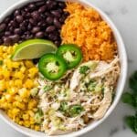 A white bowl filled with four sections: dark black beans on the top left, orange rice on the top right with a lime wedge resting on it, bright yellow corn at the bottom right, and shredded chicken mixed with light green sauce and chopped cilantro on the bottom left, garnished with green jalapeño slices placed on the chicken and beans. The bowl sits on a white marbled surface with whole jalapeño, lime, and cilantro sprigs around it, and a wooden board with more sliced jalapeño and chopped cilantro in the top left corner. Photo taken with an iphone --ar 4:5 --v 7