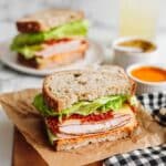 This Easy Turkey Club Sandwich elevates the classic club with a flavorful sun dried tomato mayonnaise, layered with turkey deli meat, crispy bacon, ripe avocado, and crisp romaine lettuce on your choice of bread or a wrap. Perfect for a satisfying lunch or light dinner, this sandwich is simple to assemble and packed with delicious savory flavors and textures.