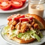 - Assemble the Po’Boys: Spread a generous amount of remoulade sauce on both sides of the toasted rolls. Layer shredded lettuce on one side and tomato slices on the other. Arrange the fried shrimp along the center, drizzle additional remoulade sauce over the shrimp.
