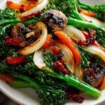 A white plate holds a colorful mix of cooked vegetables layered closely together. The bottom layer is bright green broccolini with tender stalks and leafy tops. Over this, there are caramelized white onion wedges with soft golden edges, and sautéed orange bell pepper strips adding a soft texture. Dark brown cooked mushrooms with slightly crispy edges sit among the vegetables. Small deep red pieces of sun-dried tomatoes are scattered throughout, adding bursts of color and texture. The vegetables look glossy and well cooked, showing a mix of smooth and slightly crispy surfaces. The plate is set on a white marbled textured surface. photo taken with an iphone --ar 4:5 --v 7