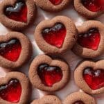 Delightfully rich and tender Heart Thumbprint Cookies featuring a cocoa-infused dough filled with sweet raspberry or strawberry jam, perfect for festive occasions or a special treat.