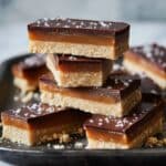 - Make the Chocolate Topping: Whisk together melted coconut oil, cocoa powder, maple syrup, and optional flaky sea salt until smooth. Pour the chocolate mixture evenly over the chilled caramel layer and smooth it out. Refrigerate again until the chocolate topping is set.