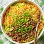 Keywords: inside out egg roll bowl, egg roll in a bowl, low carb egg roll, ground beef cabbage skillet, quick weeknight dinner