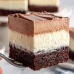 A close-up of a square layered dessert held by a woman's hand on a silver fork, showcasing three distinct layers: the bottom layer is a dense, dark brown cake with a slightly wet texture, the middle layer is a creamy off-white cheesecake with a smooth, rich surface, and the top layer is a thick, fluffy light brown mousse with some soft peaks and a glossy finish. The background shows the rest of the dessert with the same mousse layer, all sitting on a white marbled texture. photo taken with an iphone --ar 4:5 --v 7