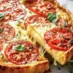Italian Tomato Pie is a savory pie featuring layers of mozzarella and Gruyère cheeses paired with ripe tomato slices on a buttery pie crust. Seasoned with oregano, basil, and olive oil, this dish is baked to golden perfection with a bubbly cheese topping and finished with fresh basil for a fresh, aromatic touch. Perfect as a flavorful appetizer or light meal.