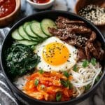 Korean Beef Bibimbap Bowl is a vibrant and satisfying dish that combines flavorful marinated beef with fresh vegetables and rice. Topped with a perfectly fried egg and spicy gochujang sauce, it’s a delicious meal that’s easy to prepare at home.