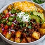This Loaded Potato Taco Bowl combines crispy roasted potatoes with savory seasoned meat and fresh toppings for a hearty and flavorful meal. It’s an easy, comforting dish that brings the best of taco night in a bowl.