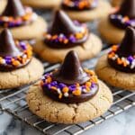 Magical Witch Hat Cookies are a delightful and whimsical treat that kids will absolutely adore. These peanut butter cookies are topped with chocolate wafers and adorned with colorful frosting, chocolate kisses, and sprinkles to resemble charming witch hats, perfect for Halloween or any fun gathering.