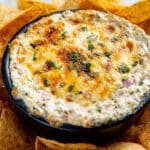 Keywords: Mississippi Sin Dip, cheesy dip, bread bowl dip, creamy dip, chicken dip, beef dip, party appetizer, baked dip