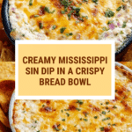 Mississippi Sin Dip is a creamy, cheesy, and savory dip combining sour cream, cream cheese, cheddar, and your choice of cooked chicken or beef. This warm, gooey dip is baked inside a hollowed French bread loaf, making an irresistible appetizer perfect for parties or cozy gatherings.
