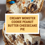 This Monster Cookie Peanut Butter Cheesecake Pie is a delightful combination of creamy peanut butter cheesecake filling topped with crunchy monster cookie pieces, chocolate chips, and colorful mini M&Ms, all nestled in a buttery pie crust and baked to perfection.
