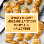 Keywords: Mummy mozzarella sticks, Halloween appetizer, cheesy snacks, crescent roll recipes, spooky snacks