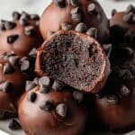 The image shows several round chocolate truffles covered in smooth, glossy dark chocolate, each topped with small, dark chocolate chips scattered unevenly on top. One truffle is bitten in half, revealing a dense, moist, and rich dark brown chocolate cake interior with a slightly crumbly texture inside. The truffles rest closely together on a white plate against a white marbled background. Photo taken with an iphone --ar 4:5 --v 7