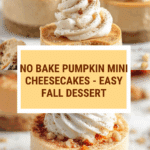 Keywords: pumpkin cheesecake, no bake dessert, mini cheesecakes, fall dessert, pumpkin puree, easy cheesecake, graham cracker crust