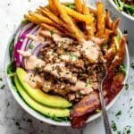 This Paleo Burger Bowl with Fries is a delicious and wholesome twist on classic burger night. With crispy baked potato fries, seasoned ground beef, crispy bacon, and fresh vegetables, it’s a satisfying meal that’s both flavorful and grain-free. The special sauce adds the perfect finishing touch to each bowl.