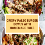 This Paleo Burger Bowls with Fries recipe offers a delicious low-carb and grain-free twist on the classic burger and fries. Crispy oven-roasted Russet potato fries paired with flavorful grass-fed beef, paleo-friendly bacon, fresh greens, and a tangy homemade sauce make it a wholesome and satisfying meal perfect for a nutritious dinner or lunch.