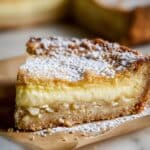 A close-up image shows a slice of soft tart with three clear layers: the bottom and top layers are thick, crumbly, golden crust with small light brown bits inside, while the middle layer is creamy and light yellow, looking smooth and rich; the tart surface is dusted with white powdered sugar. The tart slice sits on beige parchment paper with some scattered crumbs, all placed on a white marbled surface. photo taken with an iphone --ar 4:5 --v 7