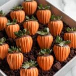 Bring a festive touch to your dessert table with these charming Pumpkin Patch Strawberries. Coated in vibrant orange chocolate and styled to look like tiny pumpkins, they’re perfect for fall celebrations or Halloween treats.
