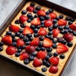 A square cake is in a grey baking pan on a white marbled surface. The cake has one visible layer with a golden brown base. On top, many whole blueberries and halved strawberries are spread evenly, creating a colorful pattern of deep blue and red against the light tan cake. The cake looks soft with a slightly rough texture where the berries sit, and the berries look juicy and fresh. Photo taken with an iphone --ar 4:5 --v 7