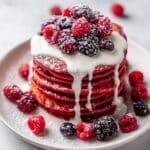 These Red Velvet Pancakes are a delightful twist on traditional pancakes, featuring a rich cocoa flavor enhanced with red food coloring for a festive look. Topped with a creamy and sweet cream cheese glaze, they are perfect for a special breakfast or brunch treat.
