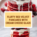 Keywords: red velvet pancakes, red velvet, breakfast pancakes, cream cheese glaze, brunch recipe, fluffy pancakes