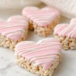 Delightfully festive Rice Krispie Hearts made by shaping classic marshmallow-coated cereal into heart shapes and decorated with pink and white candy melts. Perfect for Valentine’s Day or any special occasion, these treats are easy to make and fun to decorate.