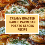 Keywords: roasted garlic, parmesan potato stacks, potato side dish, baked potatoes, garlic sauce, comfort food, holiday side, Yukon Gold potatoes