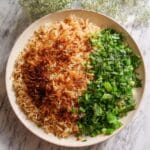 - Make crispy rice: Preheat your oven to 400°F (200°C). Transfer the cooled or leftover rice to a parchment-lined tray. Drizzle 1 tablespoon each of soy sauce, sesame oil, and chili oil over the rice and mix well. Spread the rice thinly and evenly in one layer and bake for 25–30 minutes, stirring after 15 and 20 minutes to prevent burning and ensure even crispiness. Alternatively, air fry at 400°F (200°C) for 15 minutes, stirring several times.