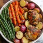- Serve: Plate the chicken thighs alongside the cooked potatoes, carrots, and green beans. Spoon extra sauce over the top and garnish with chopped fresh parsley for a bright and fresh finish.