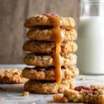 A stack of seven golden brown oatmeal cookies is shown on a white marbled surface, with a creamy caramel sauce dripping from the top cookie down the sides of the stack. The cookies have a rough, crumbly texture and some oat flakes are visible. On the top cookie, there are small pieces of pecans embedded in the caramel layer. To the side, a single cookie lays flat with some crumbs around it. In the background, there is a blurred glass bottle filled with milk. photo taken with an iphone --ar 4:5 --v 7