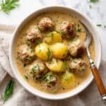 This hearty and comforting Swedish Meatball Soup combines tender, flavorful meatballs with a rich and creamy broth loaded with baby yellow potatoes and aromatic spices. Infused with hints of nutmeg, allspice, and fresh herbs, the soup is finished with a creamy touch of sour cream, making it a delightful and warming meal perfect for colder days.