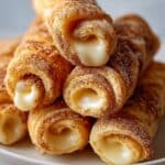The image shows several golden-brown rolled pastries stacked on a white plate. Each pastry has visible layers of crispy dough wrapped around a smooth, creamy white filling that peeks out at the ends. The outer dough is lightly dusted with cinnamon sugar, giving it a textured, slightly grainy look. The pastries have a soft sheen, indicating they are fresh and slightly glazed. The white plate sits on a white marbled surface. photo taken with an iphone --ar 4:5 --v 7